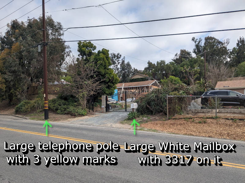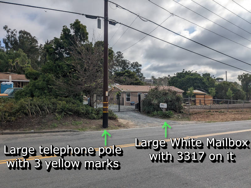 Our street address is 3317 Descanso Ave and we recieve packages for surnames Charlesworth, Dremann and Hudlow. Our driveway has a large telephone pole with 3 yellow marks on it and a single large white mailbox with 3317 on it.