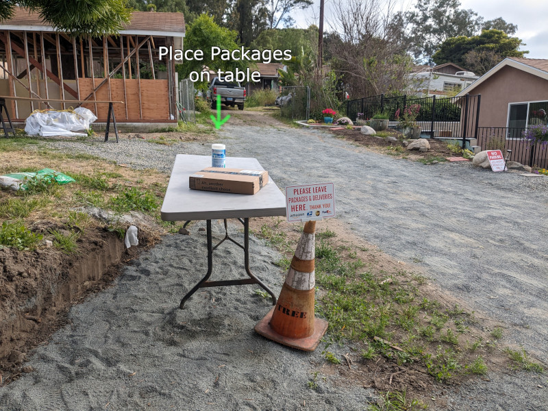 Please honk your horn and then leave packages on the table that is setup just inside the pedestrian gate left of the main gate. The pedestrian gate is open, come on in and set the packages on the table.